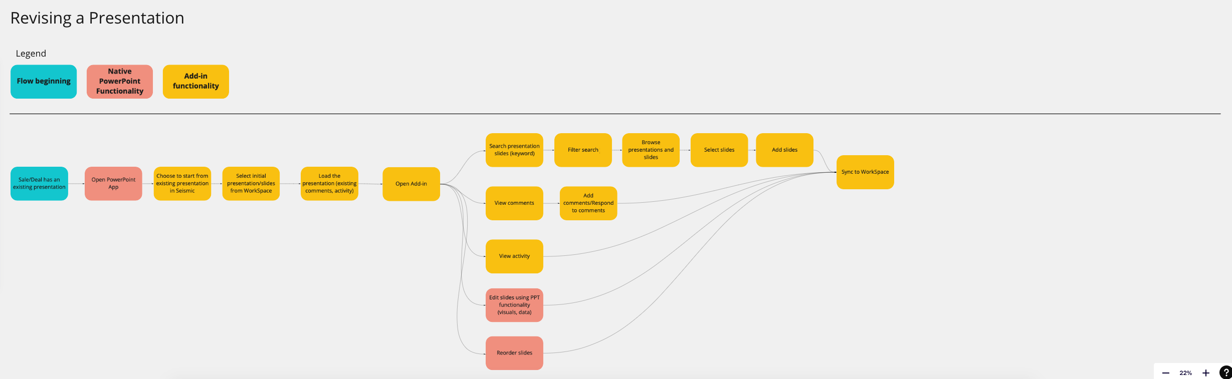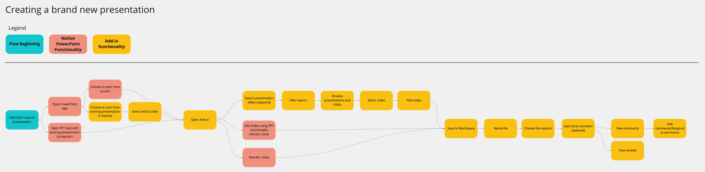 Both of these flows covered the bases when a sales/analysts gets a new request to build a presentation for a deal and when a sales/analyst is required to make edits to the presentation they originally created. Using color coding, I determined how the flow would begin (teal), what functionality would be native to PowerPoint (orange), and what functionality the add-in would need to account for (yellow).