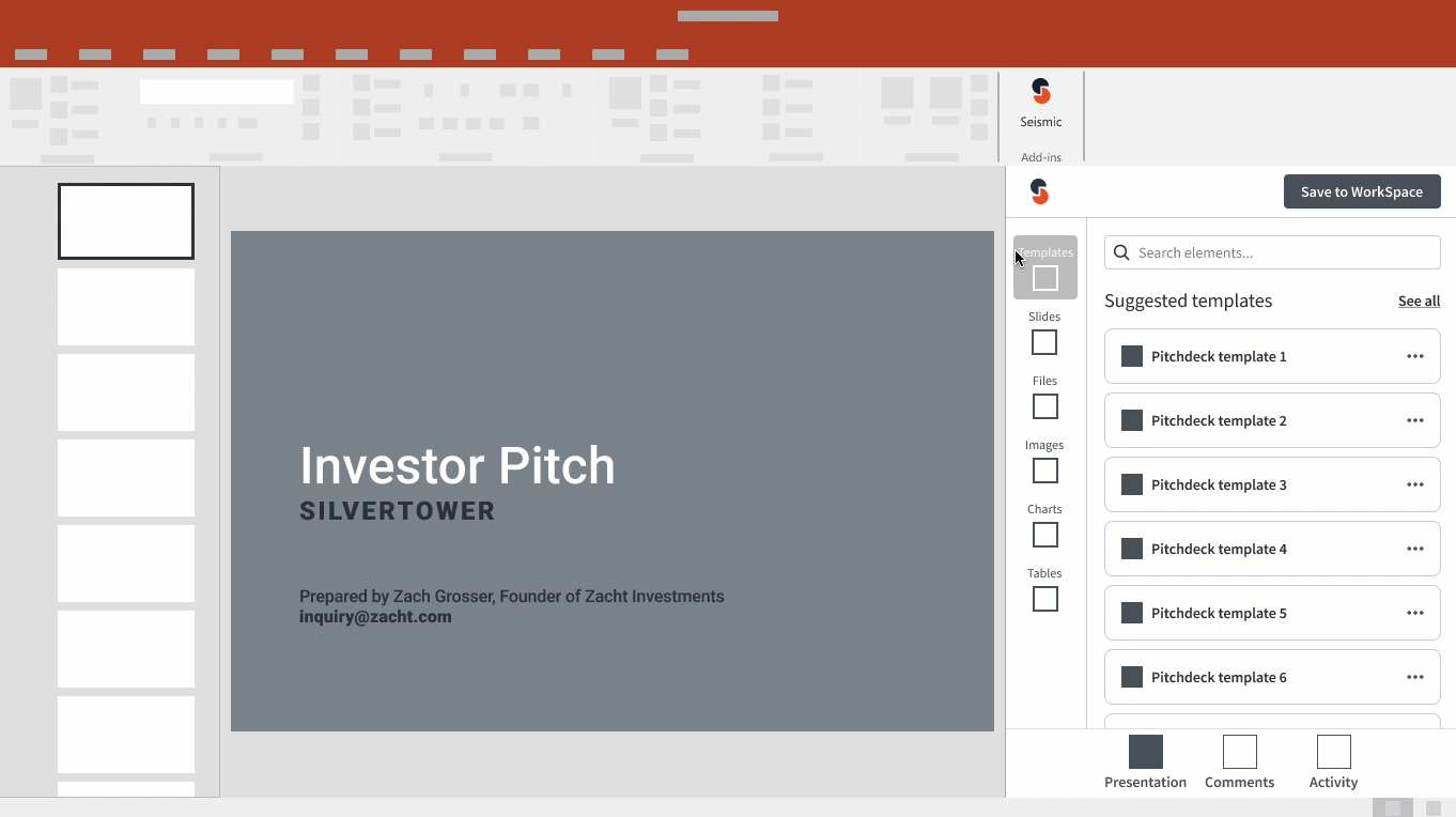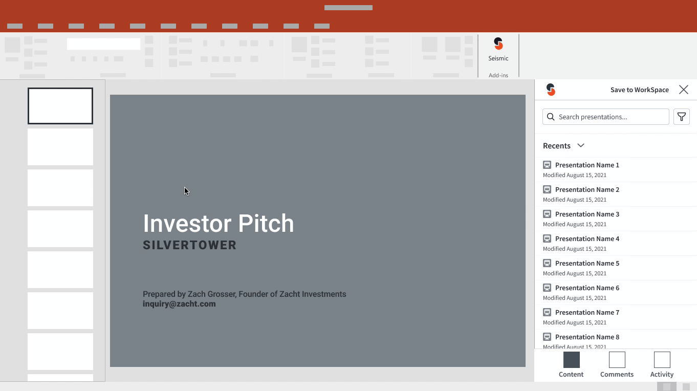 A Microsoft add-in that leverages content in Seismic’s library and allows sellers to pull slides from existing presentations, stay up-to-date on slide updates pushed by marketers. The add-in encourages collaboration through comments, annotations, and revision history.
