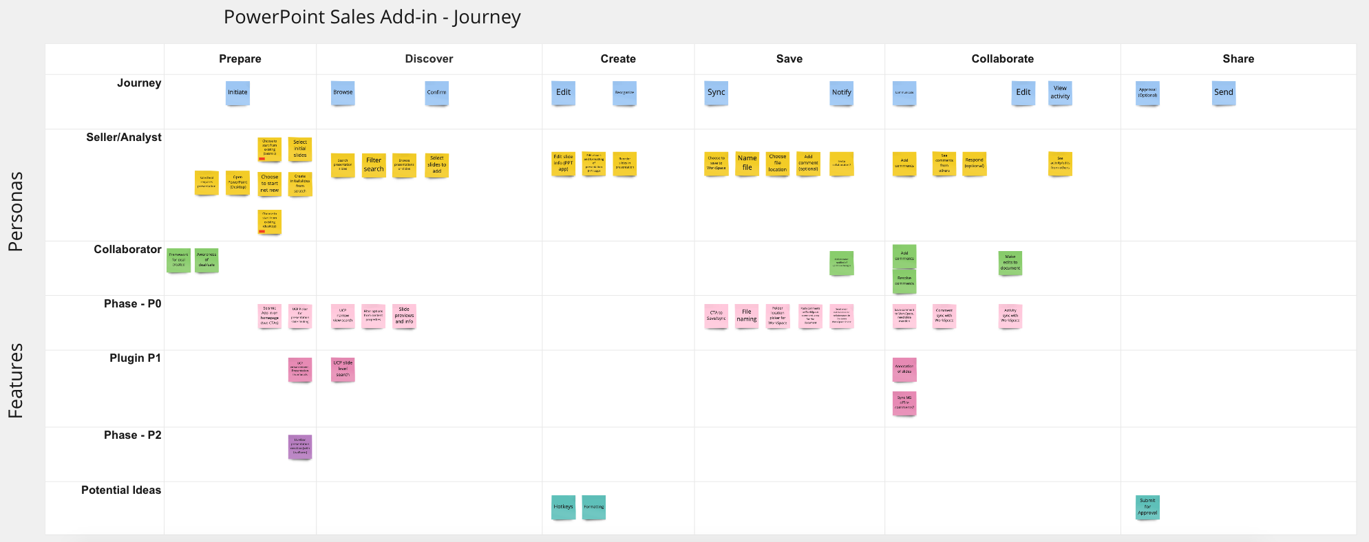 Once my discovery research was finished, I started mapping out the journey of the users. I created this diagram that outlined themes throughout the journey (top headers). Within each journey theme, I defined sub themes and actions that each persona (Seller/Analyst and Collaborators) would take to create a presentation. The product managers helped to define needed functionality based on the requirements and I helped to determine which phase the development team would build this functionality.