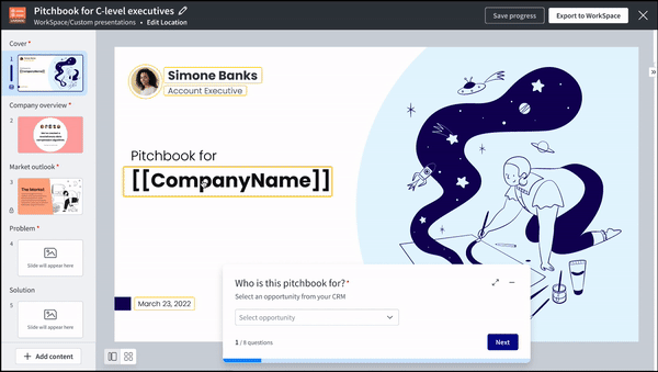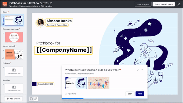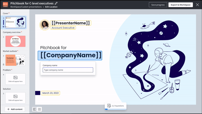 Create a experience that allows a user to fill out a variable placeholder at any time when they are assembling their presentation deck