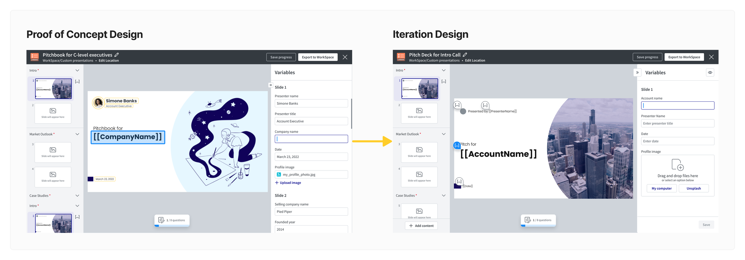 After discussing all the pros and cons and potential use-cases for each concept with my product manager, I decided to move forward and send Concept #3 - Variable Panel to my engineering team so they could create a proof of concept. My product manager and I thought that Concept #3 would work best for “power” users trying to fill out all the variables for the entire deck at one time, but still allowed for more entry-level users to fill out the variables for a slide during their assembly process.