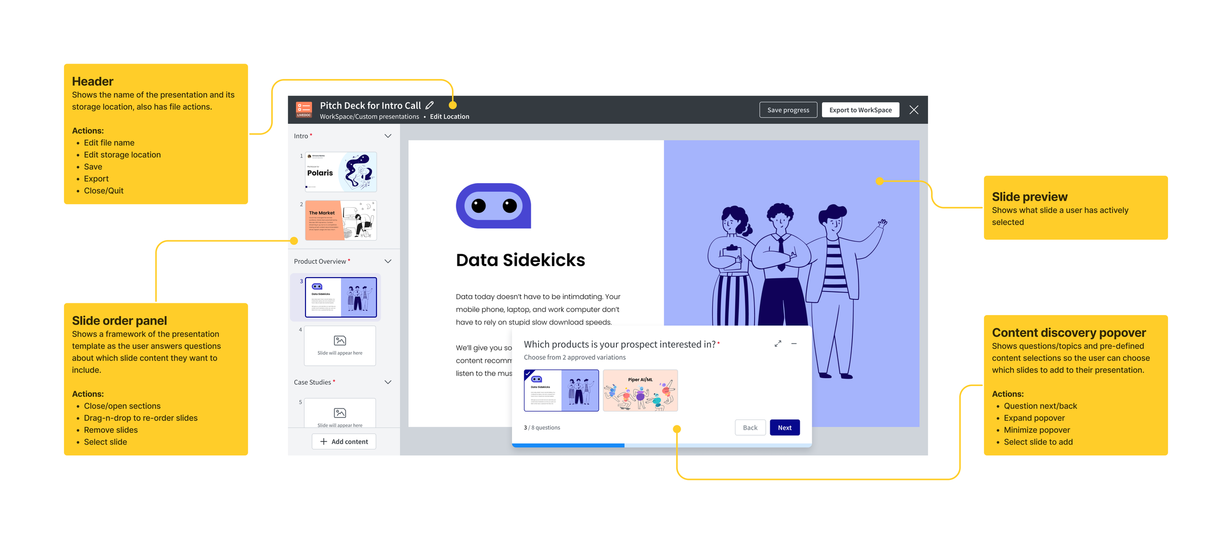 To start off my project, I decided to do an audit of the existing presentation builder solution (Guided Assembly) and all the parts of the user interface (UI). This exercise helped me to identify the purpose of each part of the UI and the actions within each part. I knew that when building the placeholder/variable replacement feature, it would need to fit into the information architecture of the existing presentation builder experience.